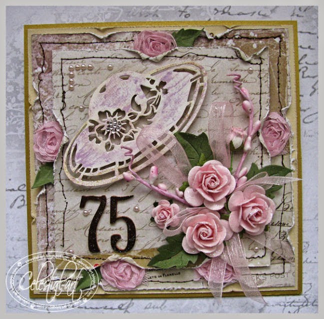 ... na 75-te urodziny. Tak mi się jakoś z panią w kapeluszu skojarzyło :) Do tego jakieś przeszycia, szarpania, perełki, róże i wstążeczka.